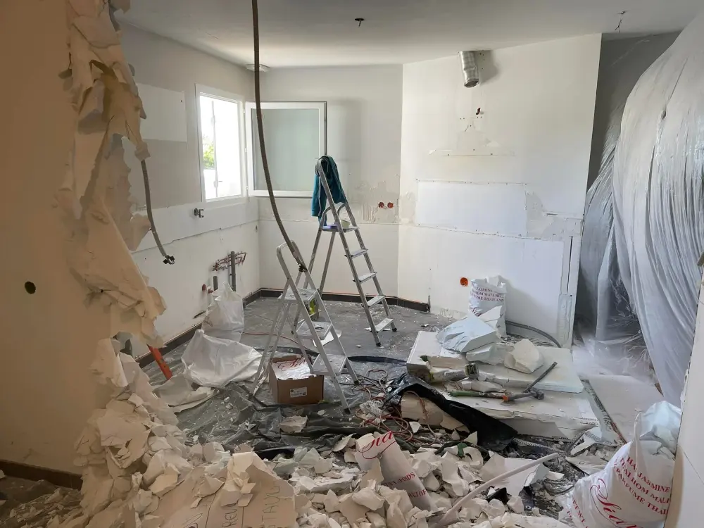 Nos images illustrent chaque étape du chantier, de la reconstruction des cloisons, murs et plafonds, à l'installation d'une cuisine américaine moderne et fonctionnelle.