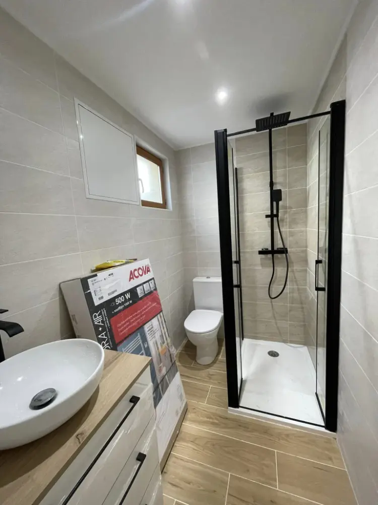 Équipements et finitions modernes : Installation d’une robinetterie noire, d’une vasque contemporaine, d’un WC suspendu, d’un sèche-serviettes et d’une douche à l’italienne.