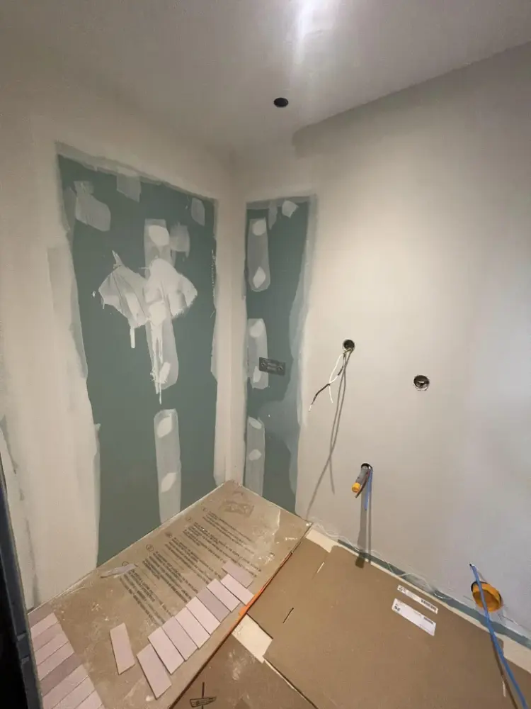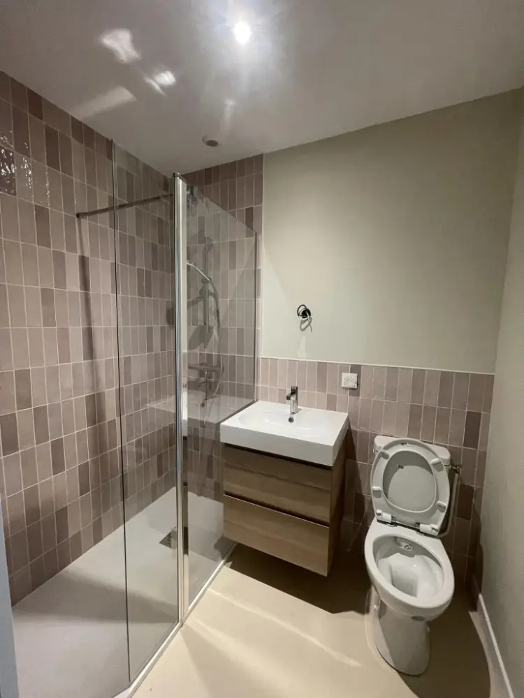 - Pose de carrelage mural : Un carrelage moderne a été installé sur les murs, apportant à la pièce un aspect soigné et une finition durable.